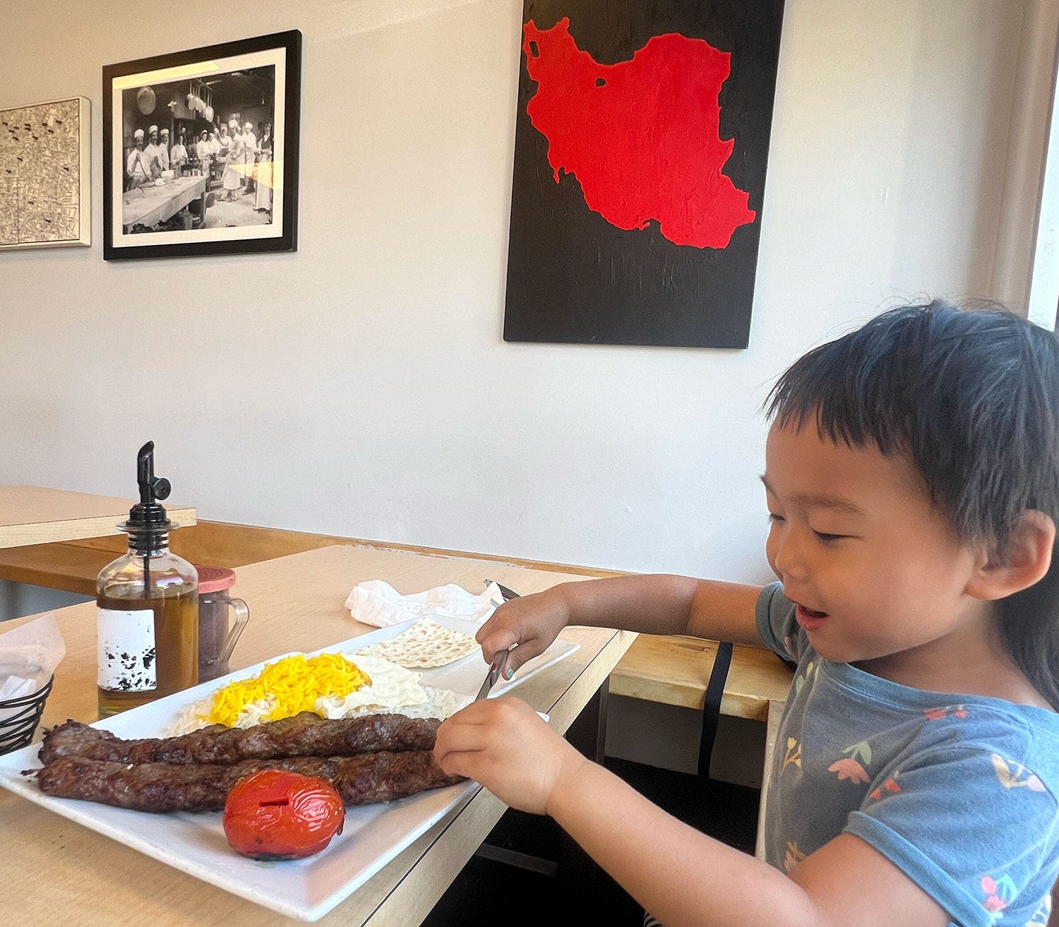 Doomscrolling was even more painful than usual, because of my eye. In a bit of a daze, I drove you to Westwood and sat down at our favorite Persian spot. I pointed a map of Tehran on the wall, and explained that this is where Auntie Mojdeh is from. I thought about all the places I grew up learning about only as war foes. We scraped the plate clean.
