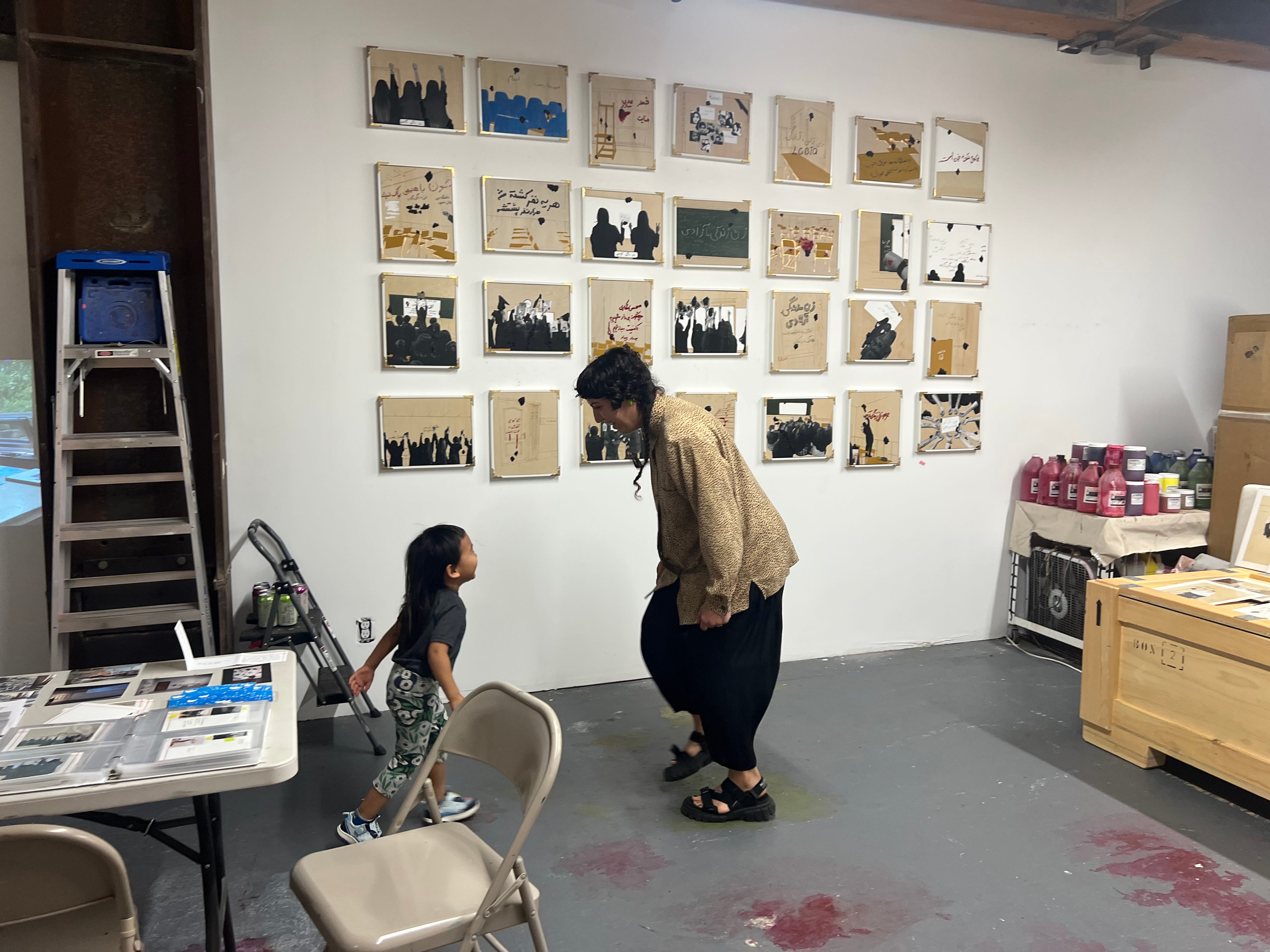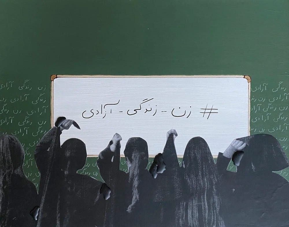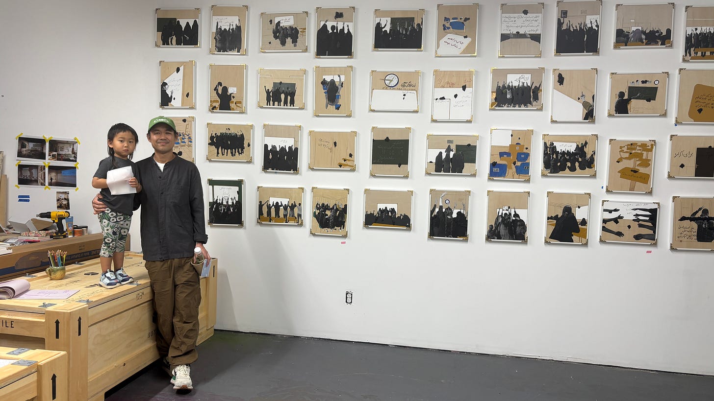 The normal winter heatwave finally returned on the last week of February, as my final few days as a Smithsonian curator counted down. To mark the occasion, I brought you along for a studio visit with Mojdeh Rezaeipour, an artist who I befriended at a Zoom event during the pandemic (a period before you were born, when we also had a good excuse to not leave the house). Mojdeh is a master of splicing the wonderment of childhood with the weight of social upheaval, showing how the two are interconnected. Her current body of work, Classroom Solidarities, features mixed-media recreations of scenes from school protests in Iran, beginning with the Jin Jiyan Azadi uprising of 2022.