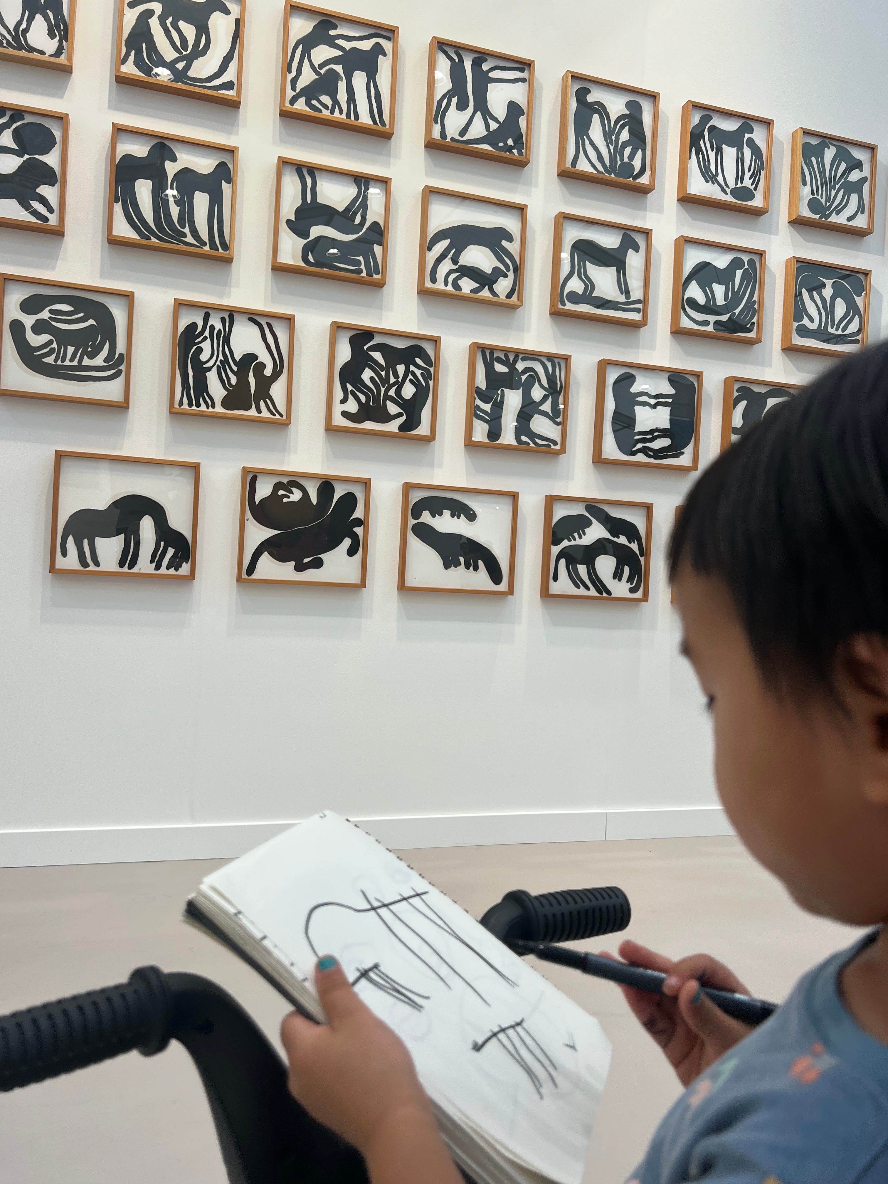 I blame it on my eye meds that it took me a whole hour to realize you were restless because I had talked up an art studio visit, only to not present a single art supply. Mojdeh whipped out Prismacolors and graph paper, and you scurried atop an art crate to churn out drawings of helicopters, only taking breaks to play this new game you’ve been psyched about, called “tag.”