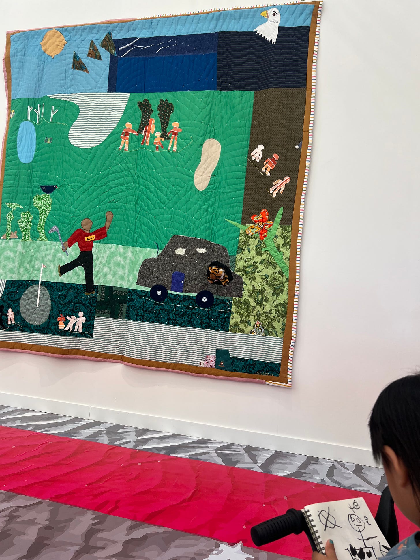 I didn’t know what I was looking for when I entered the fair, but you did: animals and cars. I followed you as you wove through the crowds on your trike, stopping at works that inspired you to doodle into your notebook. We spent time fixated on pieces that I would’ve completely missed on my own. Immediately upon walking in, you gravitated toward the towering quilts of Yvonne Wells, where we spent a good half-hour.